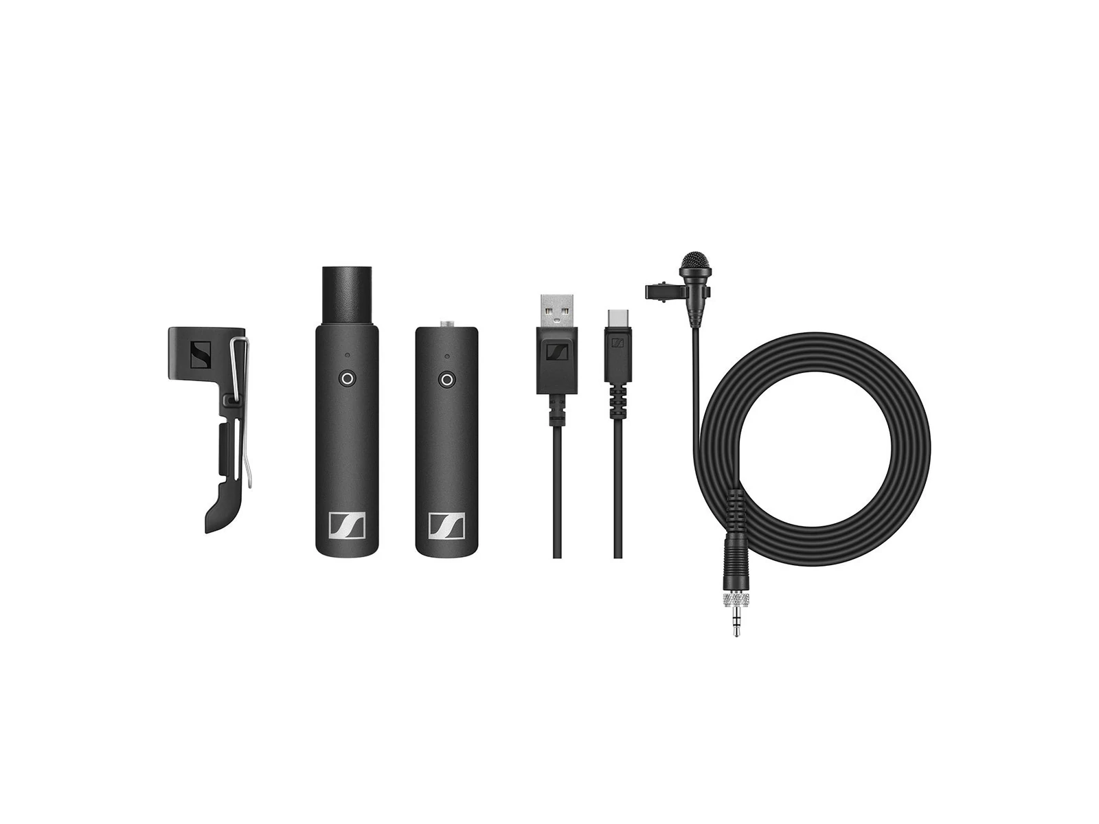 XS Wireless Digital csíptetős mikrofonkészlet. Egy gombnyomásos, egyszerűen működtethető audiokészülék ME2-II csíptetős mikrofonnal, XSW-D 3,5 mm-es jeladóval, XSW-D XLR vevővel, övcsíptetővel és USB-A - USB-C töltőkábellel.
